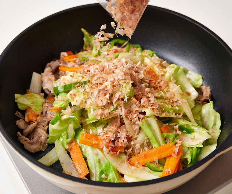料理の味が決まらない、もう少し塩や醤油を足したいときもかつお節がおすすめです。塩気を足すのではなく、かつお節を加えるとうま味がプラスされておいしくなります。また、しょうゆの量を減らして、かつお節を加えるといった使い方もおすすめです。しょうゆ大さじ1には2.6g、みそ大さじ1には2.2gの塩分が含まれていますが、かつお節であれば、1パック(2.0g)あたり0.03gと塩分はごく微量です。
