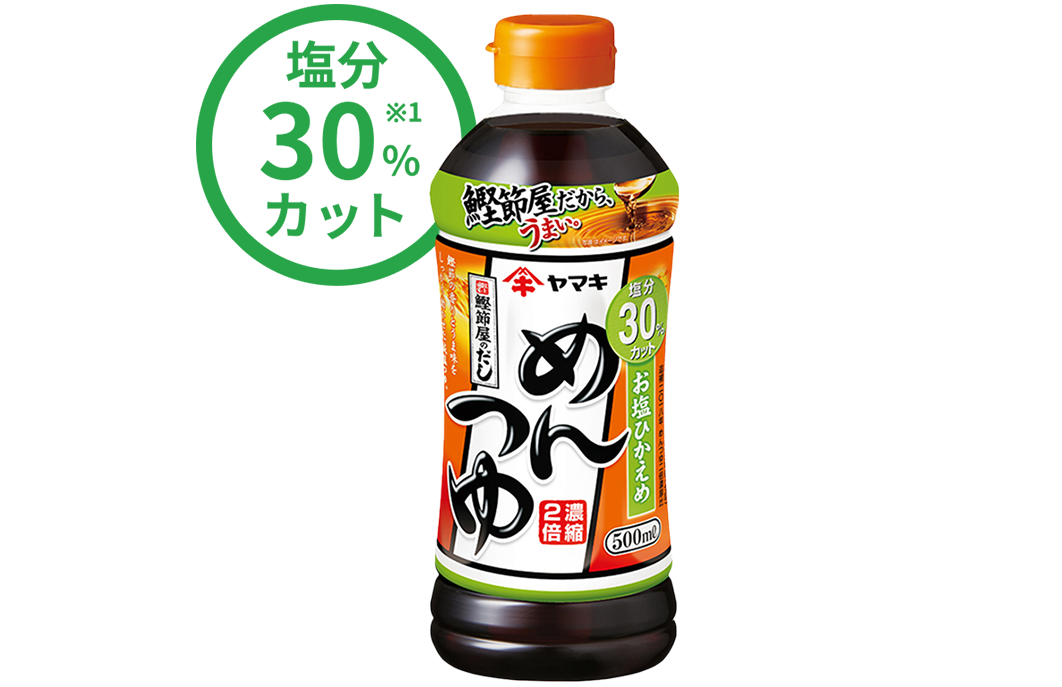 塩分30%カット(※1)の濃縮2倍めんつゆです。※1 日本食品標準成分表2020年版(八訂)めんつゆ二倍濃縮比