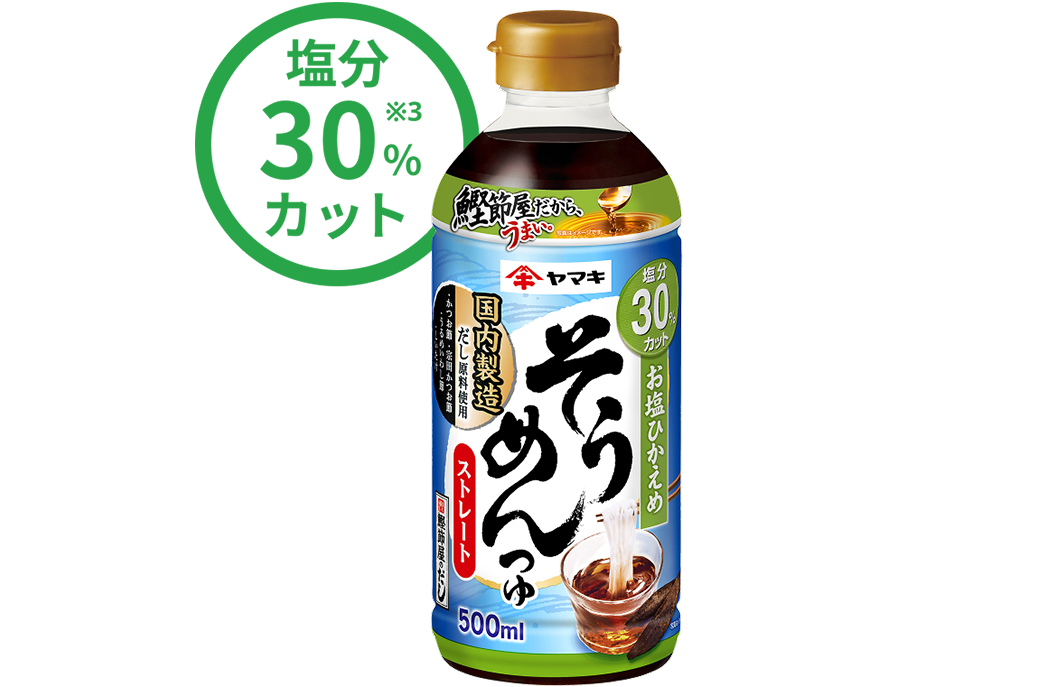 ストレートそうめんつゆ国内製造だし原料を使用した塩分30%カット(※3)の