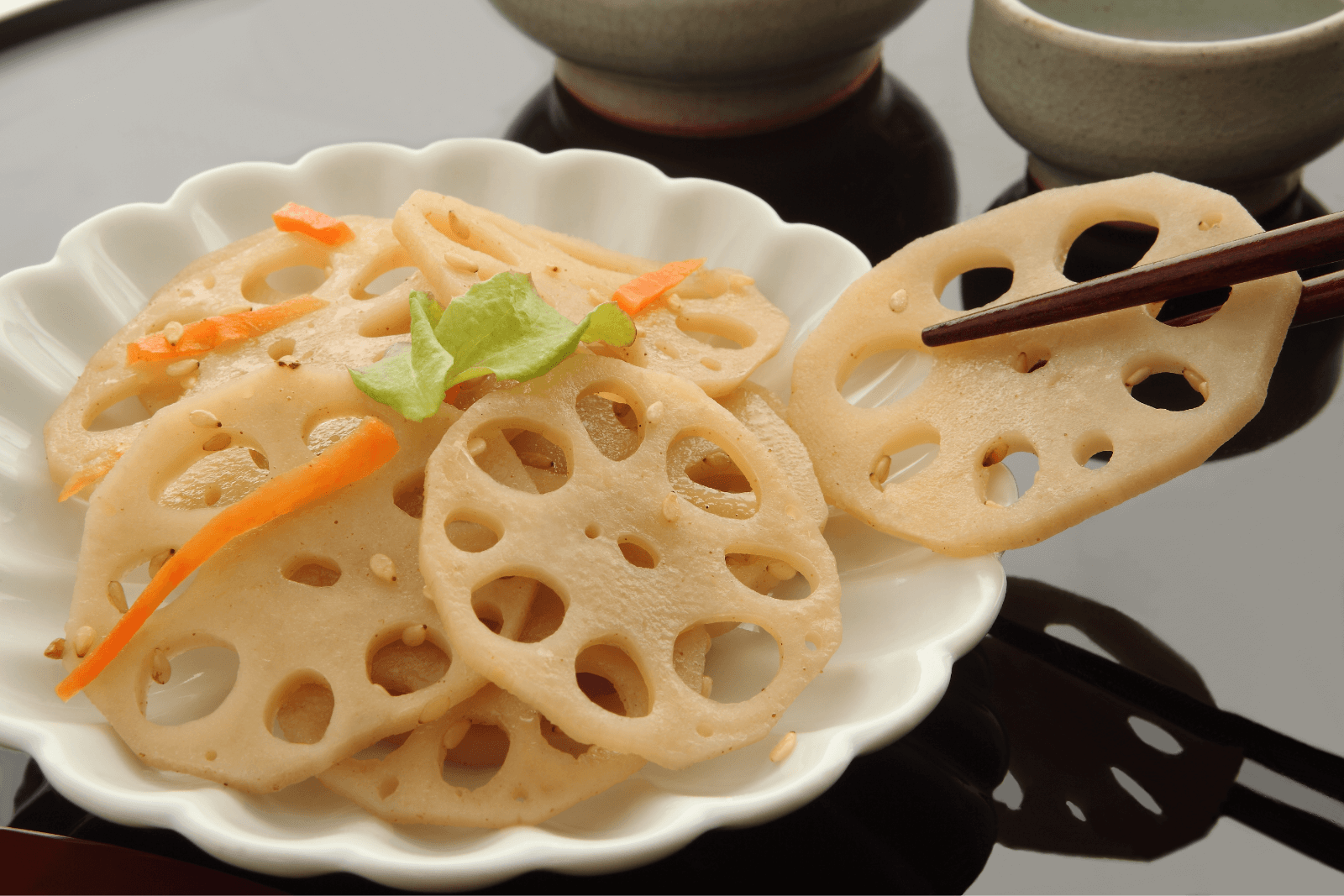 れんこんは、蓮(はす)の地下茎にあたる部分で、日本には奈良時代以降に中国から伝わったといわれています(注1)。お正月のおせち料理にも欠かせない存在で、穴が空いている形から「先の見通しが良い」と縁起物としても親しまれてきました(注1)。古くから食用とされ、行事食だけでなく日常の料理にも取り入れやすい食材です。