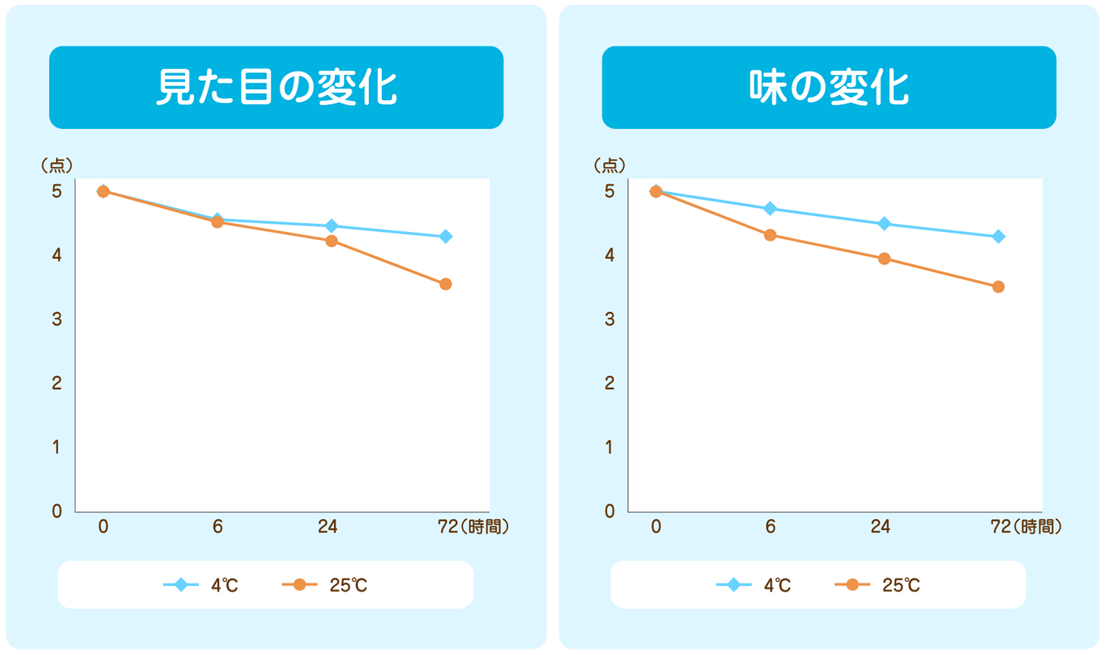 開封後6時間までは4℃保管と25℃保管の見た目についての評価に大きな差はありませんが、6時間を過ぎたころから、4℃保管しているかつお節よりも25℃保管しているかつお節の見た目評価の方が、大きく下がっています。また味の評価についても、見た目の評価と同じように25℃の室温で保存した花かつおの方が変化が著しい結果となりました。