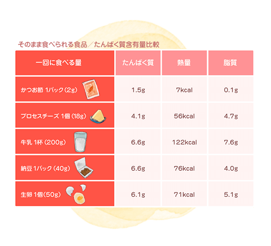 一般的に手軽にたんぱく質を補える他の食品と比べてみると、少量でもかつお節には比較的多くのたんぱく質が含まれています。また、1回の食事にかつお節1パック(2g)を追加しても、熱量や脂質は多くないので手軽に普段の食事に取り入れることができます。