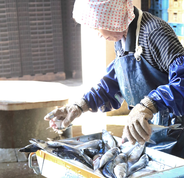 水揚げから加工までの約2時間が勝負。 地下から汲み上げた塩水できれいに洗ったら、その中にサッと蒸篭を差し込み、サッと引き上げます。一面に並んだ魚を、1つ1つ重なりがないようサッと揃えたら、次の蒸篭を差し込んで。この一連の動きをテンポよく繰り返していきます。鮮度を落とさないよう急ぎながらも、すべて手作業で丁寧に。このちょっとしたひと手間で、仕上がりが変わることを職人たちが熟知しているからです。