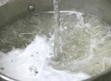 鍋にたっぷりの湯(2人分200gの場合で約3リットル)を沸かし、そばをパラパラと入れて強火でゆでる。