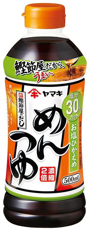 だしを効かせ、かつお節の風味を大切にしながら塩分を30%カット(※3)した濃縮2倍めんつゆです。だしのうま味と香りを効かせることで、減塩しながらも既存の「ヤマキ めんつゆ 500ml」と同様の味に仕上げました。「めんつゆ」と同じように使用でき、いつもの味で30%減塩をすることができます。