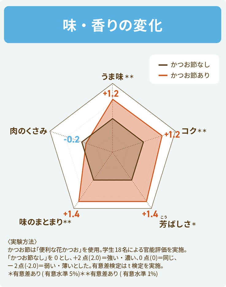 本コンテンツでは、かつお節の有無による味や香りの変化をイラストやグラフを用いてわかりやすくまとめている他、学生の感想や本田講師のコメント、各メニューのレシピも紹介しています。