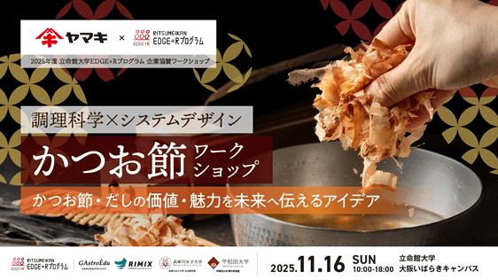 ヤマキ株式会社(本社:愛媛県伊予市 代表取締役社長:城戸善浩 以下ヤマキ)は、立命館大学・武庫川女子大学本田研究室・早稲田大学野中研究室と共同で、2025年11月16日(日)に「かつお節ワークショップ」を開催しました。本ワークショップは、イノベーション創出人材の育成を目的とした立命館大学「EDGE+Rプログラム」の一環として実施されたものです。