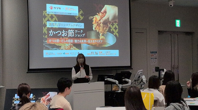 今回のワークショップでは、かつお節という素材を通して、その機能や魅力を科学的に見つめ直し、食文化として受け継がれてきた価値を再発見することを大切にしました。調理科学のパートでは、だしやかつお節が料理の中でどのように働き、味覚や体験にどのような影響をもたらすのかを科学的に整理し、学生のみなさんがアイデアを構築するうえでの基盤となる知見を提供しました。発表では、おいしさだけにとどまらず、多様な視点からかつお節の価値を捉え直した提案が生まれ、素材への理解を深めたプロセスがうかがえました。今回の学びが、日常的な食の営みを再解釈する視座の形成につながれば幸いです。