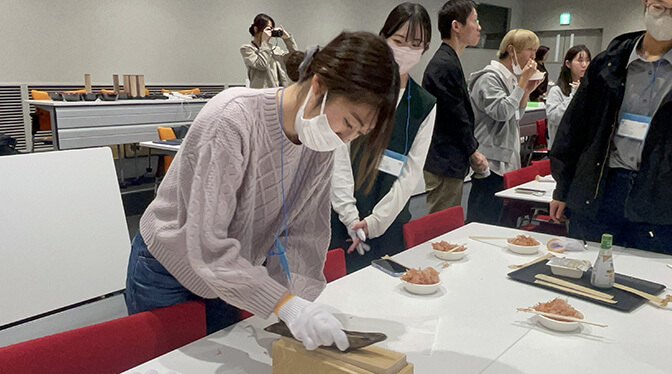「かつお節削り体験」では、学生たちから「削りたては全然ちがう」「香りがすごい」といった声が上がり、五感を通じてかつお節の魅力を実感する場面が多く見られました。