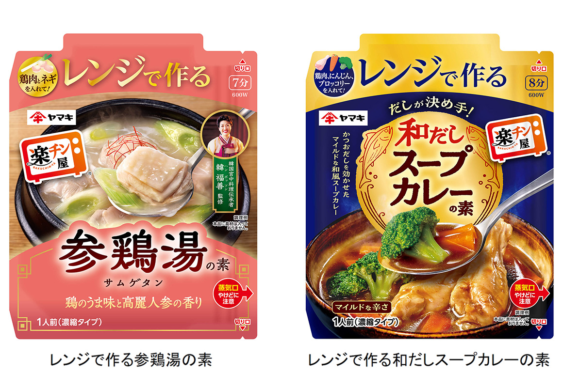ヤマキ株式会社(本社:愛媛県伊予市 代表取締役社長:城戸善浩 以下ヤマキ)は、電子レンジ専用調味料『楽チン屋®』シリーズの第二弾として、「レンジで作る参鶏湯の素」「レンジで作る和だしスープカレーの素」の2品を発売します。具材を入れて電子レンジで加熱するだけで手作り感と食べ応えのある本格的なスープを簡単に作ることができる新商品です。