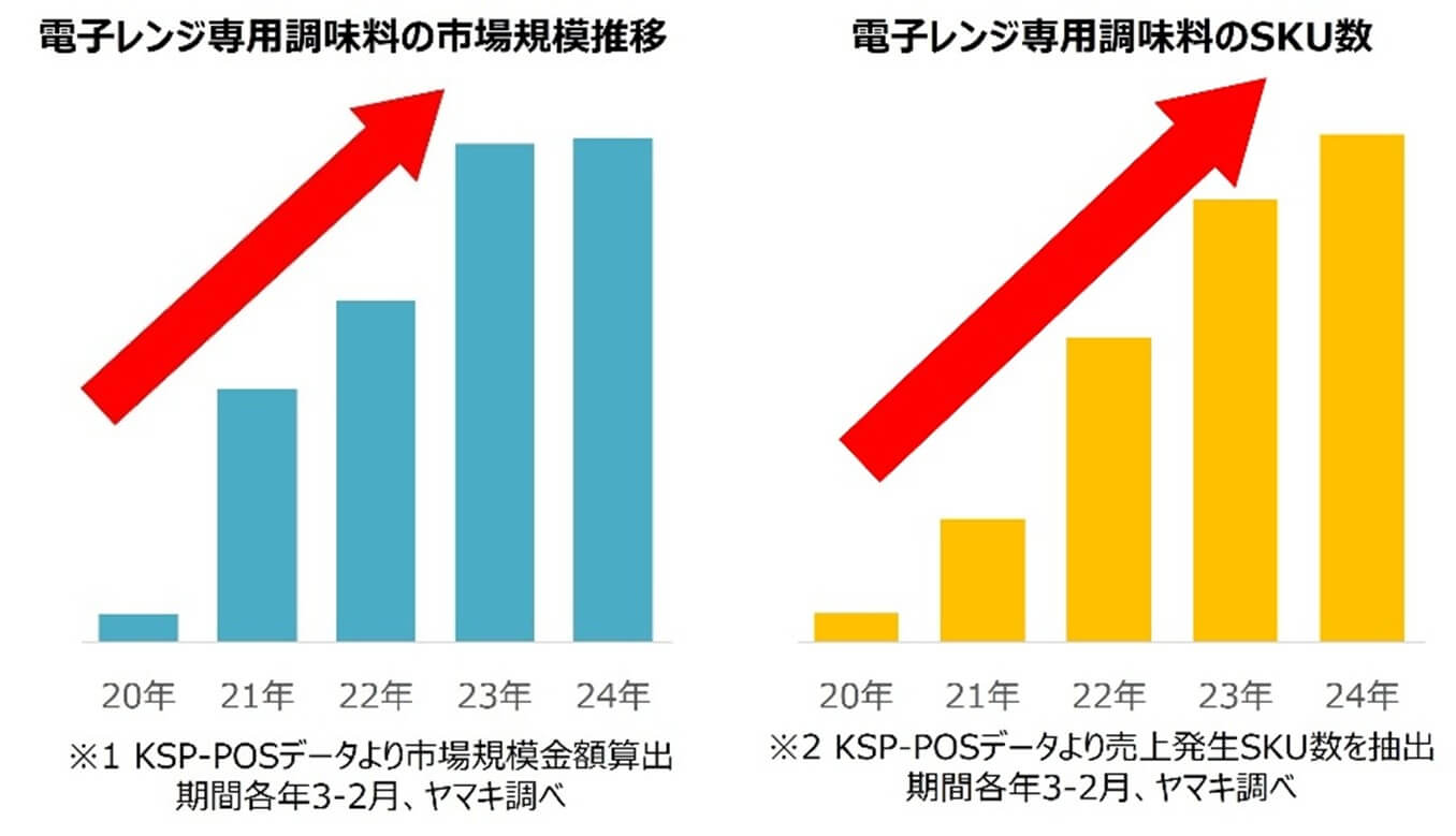 近年、ライフスタイルの多様化や調理家電の進化により、家庭でも「時短」と「本格感」を両立した料理へのニーズが高まっています。これに伴い、電子レンジ専用調味料の市場は直近4年間で大幅に伸長(※1)しています。また、商品ラインナップ(SKU数)も同じく大幅に伸長(※2)しており、売り場では商品の品揃えやバリエーションが広がるなど、市場全体が拡大傾向にあります。こうした背景を踏まえ、ヤマキは電子レンジ専用調味料市場の中でも未開拓だったスープカテゴリーに着目。マンネリ化しがちなスープメニューに変化をもたらし、具だくさんで一品でも満足できる本格スープを簡単に楽しめる商品を開発しました。
