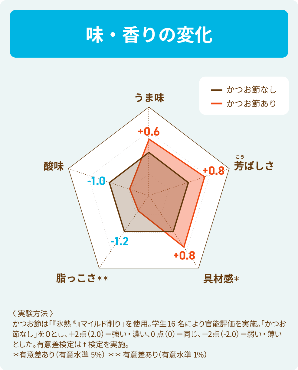 かつお節を加えることで、脂っこさや酸味が和らぎ、味のバランスが整うほか、うま味や芳ばしさ、具材感がアップすることが分かっています。また、たんぱく質の質を示す「アミノ酸スコア」が向上するなど、栄養面でもプラスの側面が確認されています。