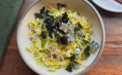 • サラダチキンと塩昆布の冷やし茶漬け